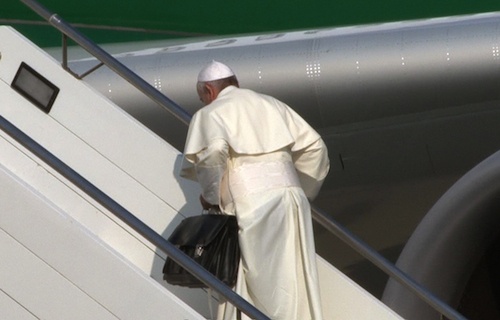 Pope Francis carrying his own bags while boarding the plane for Brazil.